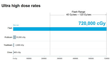 在2018年10月北美放射腫瘤學(xué)會年會上,瓦里安宣布了具有“諾貝爾獎”意義的超高劑量極速癌癥治療方法——“Flash”。這將是革命性的最新粒子治療方法。Flash 療法是一種非侵入性治療,以極高的劑量及劑量率(72萬cGy/分鐘)在極短的時間里(1秒內(nèi))對人體癌癥部位釋放質(zhì)子束流。在一次照射后,癌癥細(xì)胞能就被摧毀而正常細(xì)胞損害顯著降低。目前已經(jīng)基本完成動物試驗,不久將進(jìn)入臨床試驗階段。