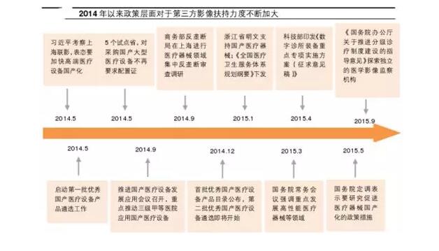 國(guó)內(nèi)的醫(yī)學(xué)影像中心復(fù)制了這種模式,但初期受限于人才引進(jìn)難、資金籌集少、隱形歧視和政策限制等原因,彼時(shí)獨(dú)立醫(yī)學(xué)影像中心在國(guó)內(nèi)發(fā)展緩慢。2016年8月,衛(wèi)計(jì)委發(fā)布《醫(yī)學(xué)影像診斷中心基本標(biāo)準(zhǔn)和管理規(guī)范(試行)》,首次明確了第三方醫(yī)學(xué)影像診斷中心獨(dú)立法人地位,其后隨著“十三五”醫(yī)改規(guī)劃中“加快社會(huì)辦醫(yī)”的內(nèi)容推出和醫(yī)療改革的不斷推進(jìn),行業(yè)終于迎來轉(zhuǎn)機(jī)。