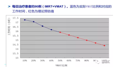 需要說明的是,有些技術本身并不是為了加快治療速度而發(fā)展起來的,例如,大分割放療技術,其發(fā)展的本質是基于其生物效應優(yōu)勢。但是我們不能否認,該技術的發(fā)展確實減少了定擺位的累計次數和時間,等于是減少了整個的治療時間,有利于在同樣多的時間里可以治療更多的患者。同樣,多采用VMAT技術,和普通IMRT相比,也能減少工作時間。如下圖所示:
