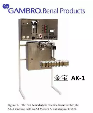 動靜脈shunt的發(fā)明,自體動靜脈內(nèi)瘺成形術(shù)的成功,給慢性腎衰患者的治療帶來了新的福音,讓透析變?yōu)榭赡?。透析設(shè)備所蘊(yùn)含的巨大商業(yè)價(jià)值也立刻被嗅覺敏銳的商人運(yùn)用起來,下圖為金寶和百特各自推出的第一代透析機(jī),如今金寶已被百特并購。