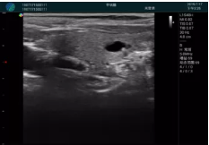 腺體內(nèi)部清晰顯示一低回聲塊影,形態(tài)不規(guī)則,邊界模糊,邊緣呈毛刺狀,內(nèi)部見砂礫樣鈣化