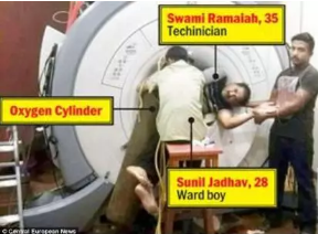 2014年11月8日,印度新孟買的塔塔紀念醫(yī)院發(fā)生了一起罕見的磁共振事故,當時,一名男性患者被推入醫(yī)院接受磁共振檢查。在掃描過程中,主治醫(yī)生讓28歲的護工Sunil Jadhav去取一個氧氣面罩。Jadhav從來沒有在MRI檢查室工作過,也不知道MRI附近不允許有任何金屬,他以為醫(yī)生是讓自己去取一個氧氣瓶。