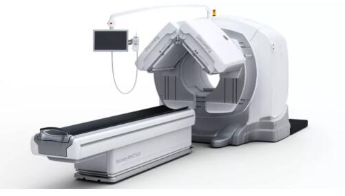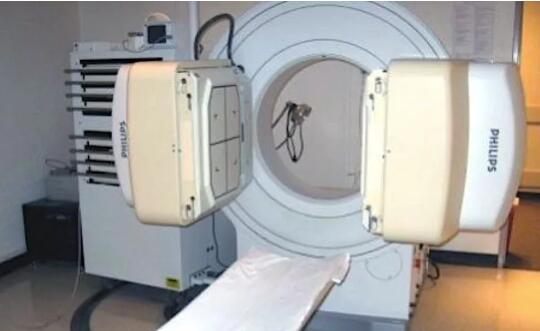 照片中的便是SPECT成像系統(tǒng),在患者診斷床的上方是SPECT成像系統(tǒng)的兩個探測器,它們重達(dá)660磅重,是可以沿著機(jī)架在患者上方旋轉(zhuǎn)的。