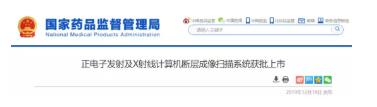 2019年12月19日,國家藥監(jiān)局發(fā)布消息,近日國家藥監(jiān)局批準上海聯影醫(yī)療科技有限公司研制的創(chuàng)新醫(yī)療器械 “正電子發(fā)射及X射線計算機斷層成像掃描系統(tǒng)”。