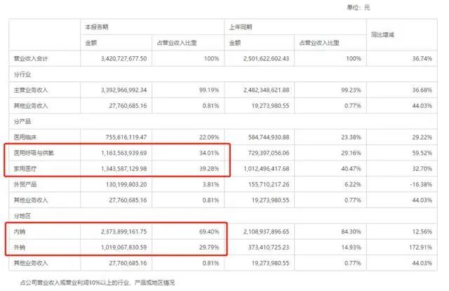 根據(jù)半年報,公司產(chǎn)品主要集中在醫(yī)用呼吸與供氧、家用醫(yī)療等領(lǐng)域,這兩項產(chǎn)品占比超過7成,且業(yè)務主要在境內(nèi)進行。所以真正能夠決定公司未來常態(tài)化業(yè)績表現(xiàn)的,不是外貿(mào)產(chǎn)品,也不是海外訂單。