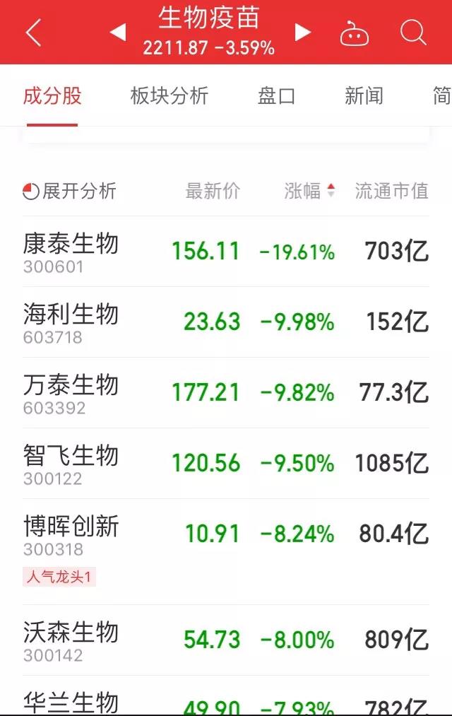受此消息影響,9月9日,A股生物疫苗概念盤中遭遇重挫,截至午盤,康泰生物逼近跌停,成為創(chuàng)業(yè)板第一支跌停的股票,海利生物跌停,萬(wàn)泰生物逼近跌停,智飛生物跌逾9%,沃森生物跌幅超8%,華蘭生物、未名醫(yī)藥等跌逾7%,康華生物跌逾6%。