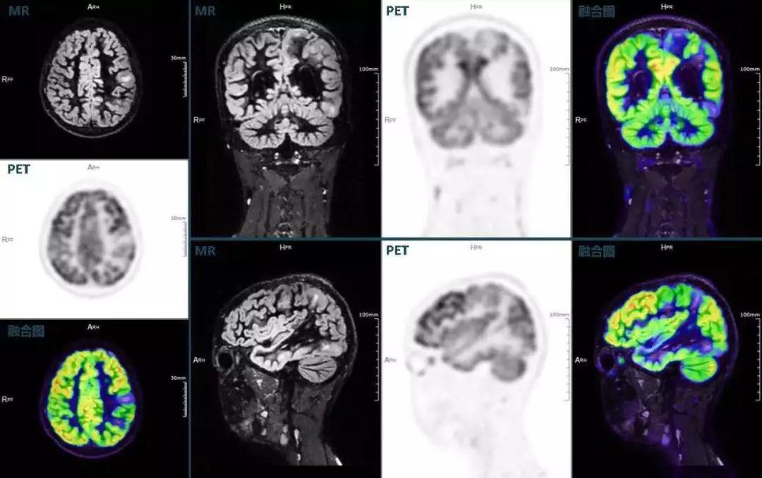 (結(jié)節(jié)性硬化,MR DIR序列清晰顯示腦皮層病理改變,PET顯示了病灶區(qū)域FDG的低濃聚。PET/MR融合顯像同時(shí)提供了結(jié)構(gòu)異常改變和功能變化的信息。)