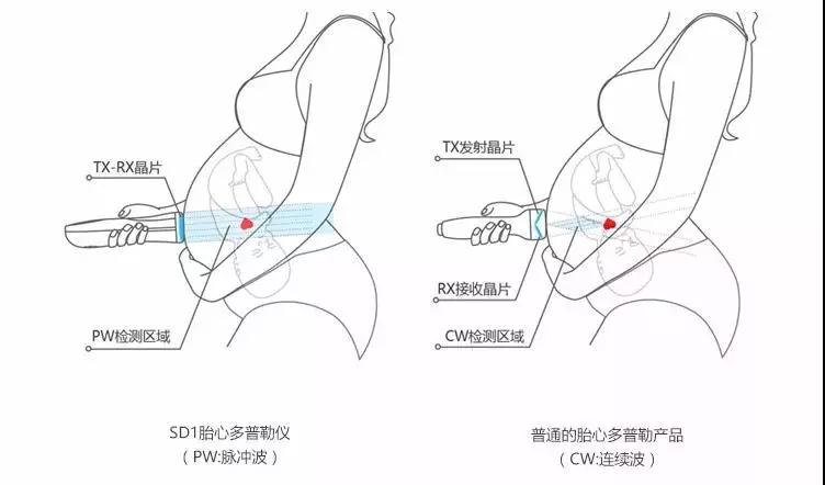 目前,市面上大部分胎心多普勒產(chǎn)品采用連續(xù)波工作模式,它的缺點是檢測面積小,尋找胎心耗時。為了便于普通用戶快速地找到胎心的位置,SD1胎心多普勒儀創(chuàng)新性地采用了單晶片脈沖波前沿技術(shù),降低找胎心角度要求,提升胎心檢測面積,幫助用戶快速尋找胎心。準(zhǔn)媽媽們再也不用擔(dān)心因為“技術(shù)”不行,找不到胎心啦!
