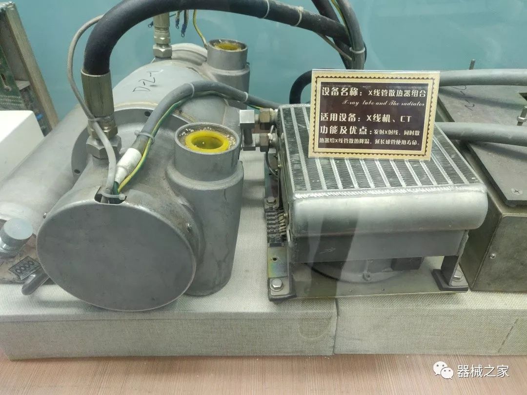 由于X線機(jī)產(chǎn)生X射線的過程中只有百分之一的動(dòng)能轉(zhuǎn)化為X射線,其余的能量都以熱能的形式散失。這就需要良好的散熱設(shè)備,也就是這個(gè)散熱器。散熱器大多采用油冷。變壓器油不僅絕緣,而且能夠吸收散亂射線,防止擊穿。使用時(shí),一般會(huì)用油泵將冷油泵入到球管周圍,將熱油從另一管導(dǎo)出,在冷卻板上冷卻,循環(huán)利用。