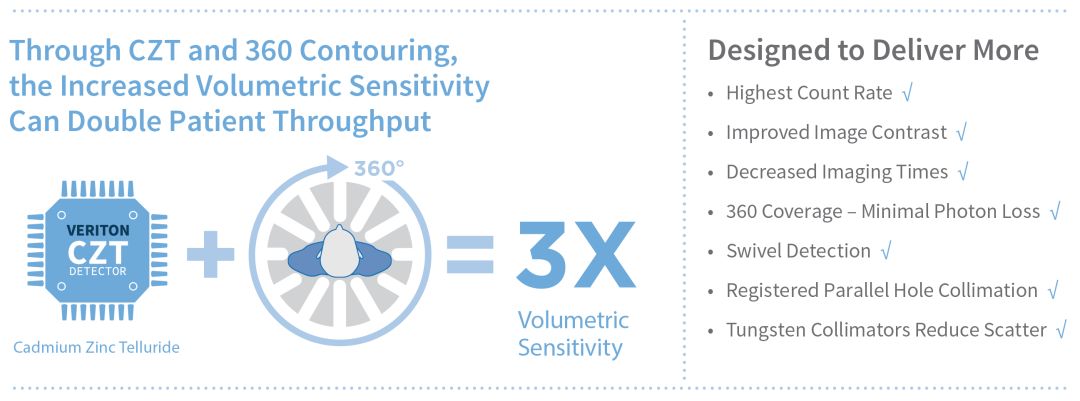 VERITON ?獨有的360°設計產生3倍的體積靈敏度,為PET提供了真正的分子成像替代品。使用更具成本效益的示蹤劑結合新的更高分辨率SPECT圖像細節(jié)來擴展您的核診斷服務。