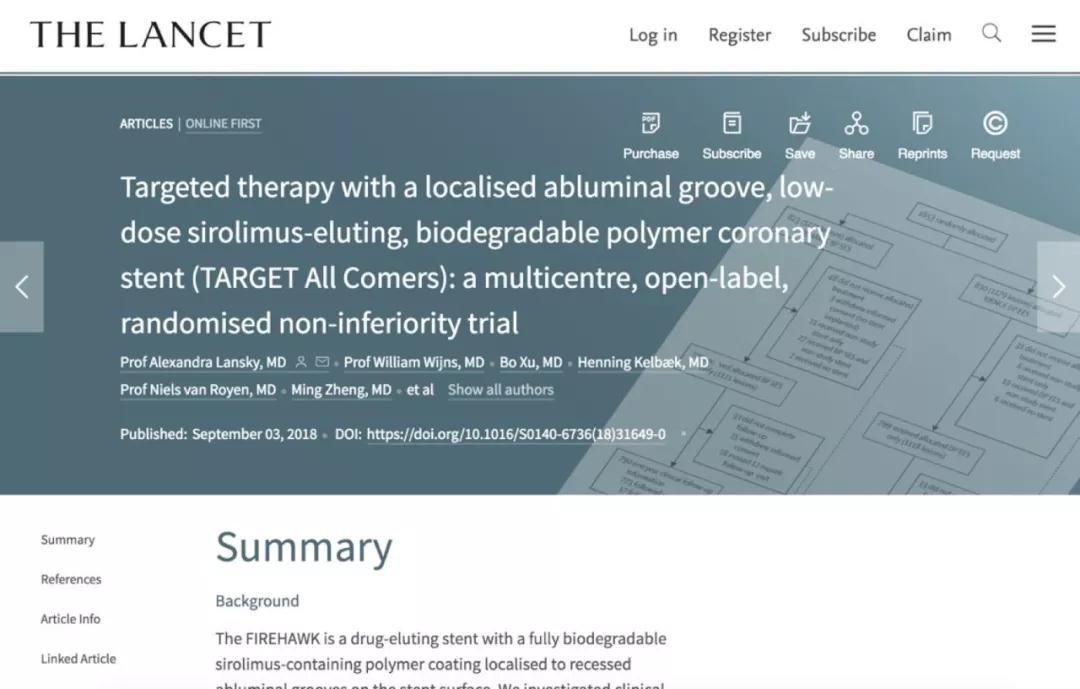 最終的試驗(yàn)結(jié)果證明中國(guó)醫(yī)療器械此行確實(shí)底氣十足?;瘊椬鳛榈谌邢蛩幬锵疵撝Ъ?,證明了患者植入后,受到治療的血管區(qū)域能夠在早期快速愈合,因?yàn)槠鋭?chuàng)新性的微槽包裹藥物、生物可降解聚合物的設(shè)計(jì),以及較低的載藥量(僅需同類產(chǎn)品三分之一的載藥量即可實(shí)現(xiàn)同等療效),安全性大幅增加,可有效減少晚期血栓事件的發(fā)生,達(dá)到了世界頂尖水平。如今,這些結(jié)論登上了《柳葉刀》,中國(guó)智造的“吶喊”迅速在全球醫(yī)學(xué)界傳播開來。