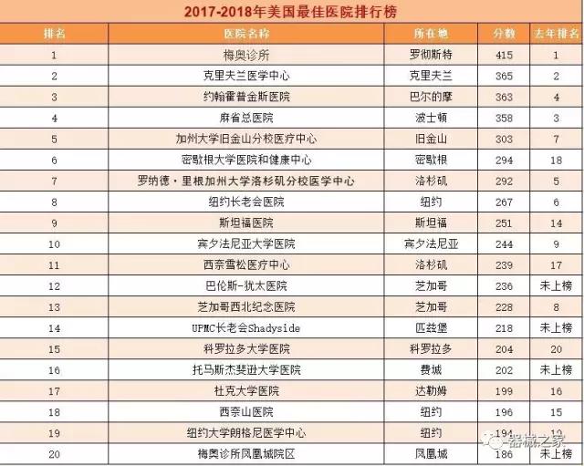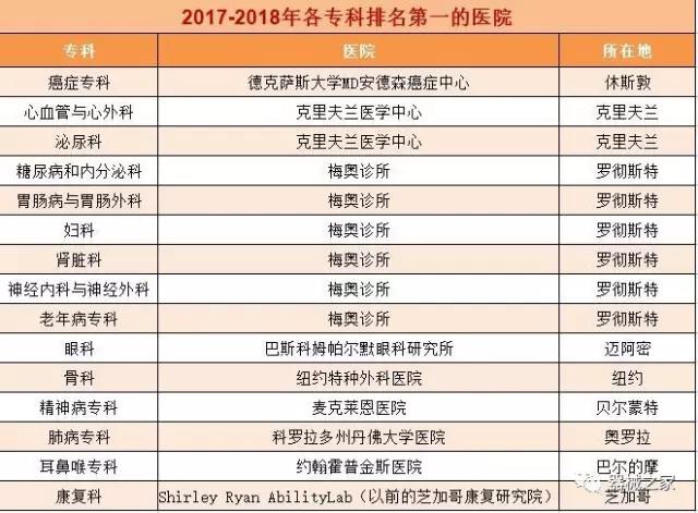 在醫(yī)療界梅奧診所就是傳說中的麥加,世界頂尖的醫(yī)療機構。2017年8月8日,《美國新聞與世界報道》公布了2017-2018美國最佳醫(yī)院排行榜,梅奧診所以415分的總分再次榮登榜首,并在糖尿病和內分泌???、胃腸科、婦科、腎臟科、神經??坪屠夏瓴W六個專科中排名第一。