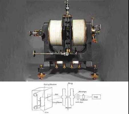 因?yàn)槊?xì)管靜電計(jì)的毛細(xì)血管不可能做的太細(xì),他無法測到更精確的電流,愛因托芬改進(jìn)了這個(gè)裝置,他利用通電的導(dǎo)體可以產(chǎn)生磁場的安培右手定律發(fā)明了----磁電式儀表。愛因托芬把提高靈敏度的任務(wù)完全交給超大的電磁鐵,而動(dòng)圈以匝數(shù)最少,質(zhì)量最輕為目標(biāo)。最終的結(jié)果是1895年推出的弦線式電流計(jì)---看清楚還不是心電圖機(jī)。