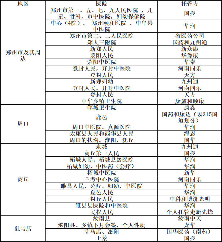 事實(shí)上,九州通、華潤(rùn)醫(yī)藥、國(guó)藥等藥事巨頭近年來(lái)高歌猛進(jìn)的藥房托管已經(jīng)為今天的耗材集采和托管服務(wù)埋下了深厚的伏筆——本質(zhì)是大規(guī)模并購(gòu)后的醫(yī)藥物流服務(wù)延伸入院的頂層利益格局的滲透。下面是河南省在2015年的藥事(含部分耗材)供應(yīng)托管統(tǒng)計(jì)表,有興趣的同仁可以深度了解一下:
