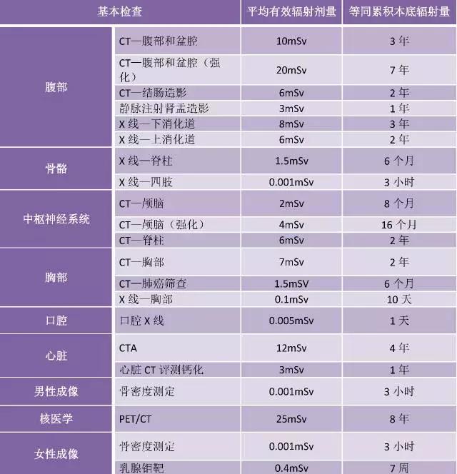 臨床中,常會(huì)遇到患者在影像檢查前問(wèn)醫(yī)生,是否有輻射,有多大的輻射呢?下圖是ACR,RSNA等組織聯(lián)合制定的常見(jiàn)影像學(xué)檢查平均輻射劑量的參考值,或許可以為你更好的回答患者的問(wèn)題提供借鑒。