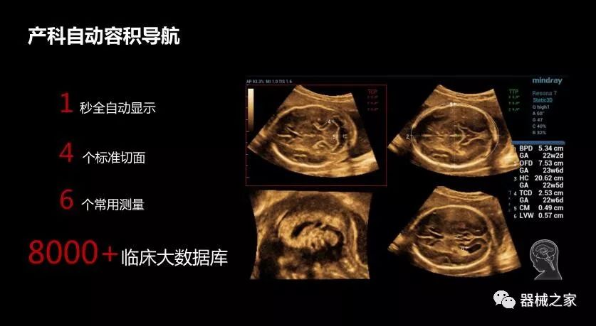 基于臨床大數(shù)據(jù)算法,女媧Resona 8在取得胎兒顱腦三維數(shù)據(jù)后,1秒的時(shí)間就可以直接顯示4個(gè)標(biāo)準(zhǔn)切面并進(jìn)行6個(gè)常用的測(cè)量。