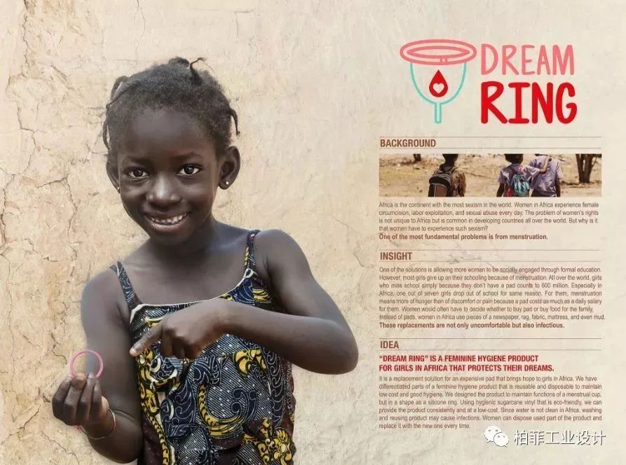 設計說明:非洲婦女每天都會經歷性別偏見和歧視,而針對這個問題所提出的解決方案是讓更多的女性參與正規(guī)教育。無法取得便宜且衛(wèi)生的女性衛(wèi)生用品是許多非洲女孩放棄上學的主要原因之一。一片衛(wèi)生棉可能會花掉一天的工資,迫使婦女在經期來時會使用報紙、破布、布料甚至泥土。DREAM RING是一款便宜又環(huán)保的女性衛(wèi)生用品,由矽膠環(huán)和甘蔗乙烯制成。可重復使用的矽膠環(huán)和拋棄式的甘蔗乙烯是DREAM RING既經濟又安全的關鍵因素。
