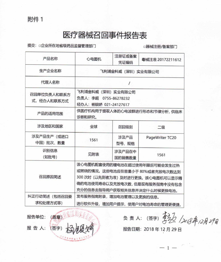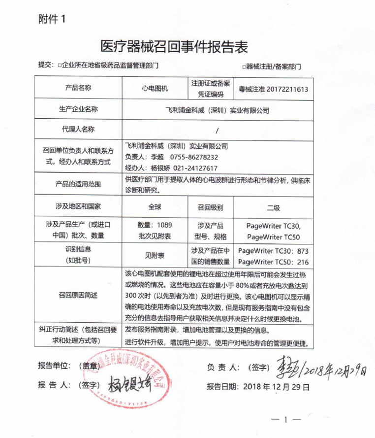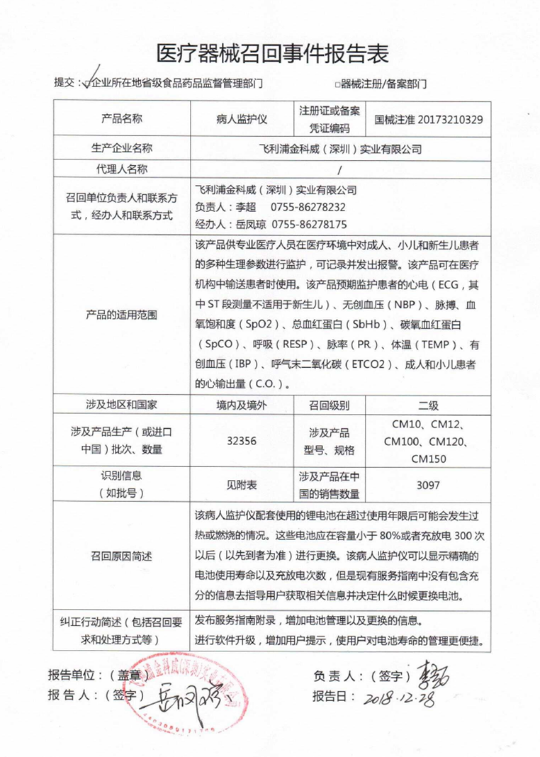 2018年,飛利浦也曾發(fā)布了多起對病人監(jiān)護儀的召回,其中一份召回報告也是二級召回,涉及到2672臺監(jiān)護儀,同樣是通過監(jiān)控內部產品投訴發(fā)現,存在鋰離子電池超過預期使用壽命后發(fā)熱或燃燒風險。