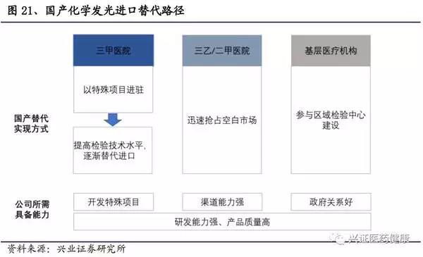 對于三甲醫(yī)院,其技術(shù)偏好較高,從目前的市場反應(yīng)來看,國產(chǎn)發(fā)光儀器和試劑的精確性和穩(wěn)定程度仍不能達到三甲醫(yī)院的要求。同時三甲醫(yī)院多有聲譽追求,對進口品牌的忠誠度高。在價格上,樣本量大、檢驗結(jié)果質(zhì)量要求高、檢驗人員成本高致使其相對價格不敏感。而國內(nèi)廠家對于試劑的研發(fā)仍停留在檢測項目的拓展上,基于現(xiàn)狀,大規(guī)模進口替代較難實現(xiàn)。有些特殊項目未涉及,如藥物濃度檢測等,可作為突破口進駐高端醫(yī)院,建立品牌形象。總體來說,短期內(nèi)國內(nèi)廠商可依靠特殊項目檢查可獲得三級醫(yī)院小部分份額,長期來看,想進駐高端醫(yī)院并獲得主力項目的份額,須加大研發(fā)投入,做好做精發(fā)光試劑,打破醫(yī)院對于國產(chǎn)山寨的慣性認知。