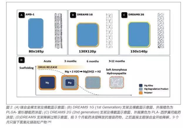 鎂是人體的必需元素,具有多種生理功能,與生命的維持、身體的健康有著極其密切的關(guān)系,因此可降解冠脈鎂合金支架研發(fā)處于可降解金屬支架的領(lǐng)先水平,以德國Biotronik 公司的鎂合金支架為代表, 前后經(jīng)歷了AMS、DREAMS 1G(drug-eluting absorbable metal scaffold 1 generation)和DREAMS 2G(drug-eluting absorbable metalscaffold 2 generation)三代支架(圖2),支架基體采用WE43 鎂合金材料[21]。AMS 為鎂合金裸支架,經(jīng)過PROGRESS 臨床實驗顯示支架具有良好的安全性,且在新生兒體內(nèi)植入兩個AMS支架后,新生兒血清鎂含量處于正常水平,且不需要進行二次手術(shù),但是降解速度太快徑向支撐力不足導(dǎo)致晚期管腔丟失現(xiàn)象嚴(yán)重,因此在該基礎(chǔ)上對鎂合金裸支架的成分和構(gòu)型進行了更新,加粗了骨架尺寸,添加了一層載有紫杉醇藥物的可降解PLGA 高分子涂層,從而增強了支架支撐力,減少內(nèi)膜增生以及降低降解速率,研發(fā)出了DREAMS 1G[22-24]。