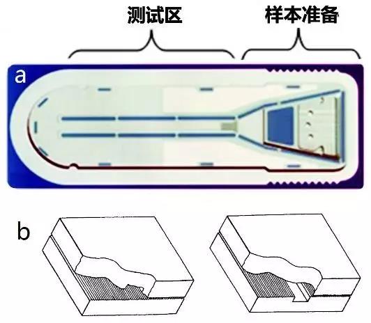 圖3所示是美國(guó)Alere公司旗下的Triage產(chǎn)品系列的測(cè)試卡結(jié)構(gòu),其中沒(méi)有任何的薄膜材料。它有上下兩層材料組成,兩層材料之間的距離是可以產(chǎn)生毛細(xì)現(xiàn)象的距離。上層為高度透明材料,目的是可以使在兩層材料之間產(chǎn)生的熒光信號(hào)不受干擾地傳播到透明材料另一側(cè)的熒光檢測(cè)器件上。底層表面的地貌隨需求變化而不同,而最突出的特征就是“搓衣板”地貌。這樣一個(gè)“搓衣板”地貌可以有效的增加表面積、增加抗體固定量及固定強(qiáng)度。在測(cè)試區(qū)域的表面上修飾的主要是捕捉抗體和封閉試劑,在樣本準(zhǔn)備區(qū)域的不同部位上修飾有熒光標(biāo)記物、檢測(cè)抗體、緩沖試劑、封閉試劑等。樣本進(jìn)入測(cè)試卡以后,其中液體溶解各種生化試劑,毛細(xì)作用推動(dòng)試劑向檢測(cè)區(qū)流動(dòng)。