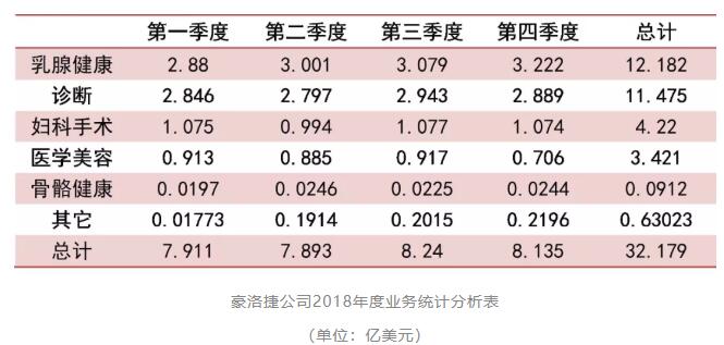 2018年第四季度,豪洛捷公司總營收收入為8.135億美元,同比增長1.3%,每股收益0.58美元。第四季的收入增長主要由乳房健康、分子診斷和國際業(yè)務(wù)三塊驅(qū)動。其中,乳腺健康業(yè)務(wù)收入為3.222億美元,同比增長7.4%;診斷業(yè)務(wù)總收入為2.889億美元,占比35.51%,同比增加3.4%;婦科手術(shù)收入為1.074億美元,同比增加3.1%。