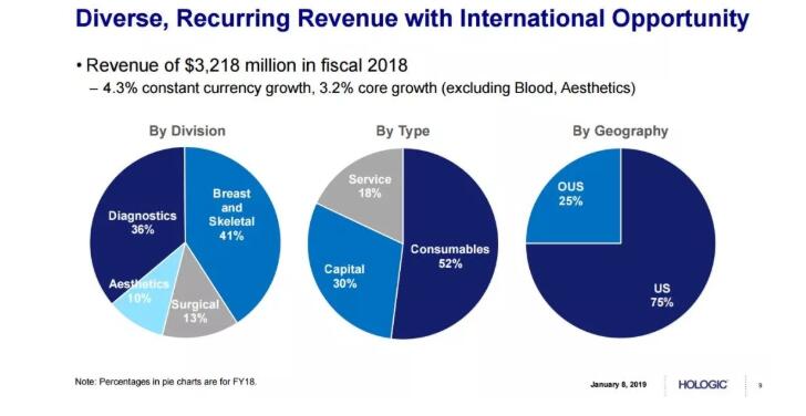 近五年來,豪洛捷財務(wù)增長穩(wěn)健。2018年,豪洛捷公司實現(xiàn)收入32.179億美元,利潤增長強勁,每股凈收益EPS達(dá)2.23美元。其中,乳腺健康和診斷業(yè)務(wù)始終有不俗表現(xiàn)。盡管醫(yī)學(xué)美容業(yè)務(wù)受到FDA相關(guān)政策的影響,但豪洛捷以16.5億美元收購Cynosure的大動作表明了它進(jìn)軍醫(yī)療美容界的野心。產(chǎn)品、服務(wù)和資本收入三足鼎立。從地域來看,豪洛捷的市場主要還是集中在美國,國際化的潛力巨大。