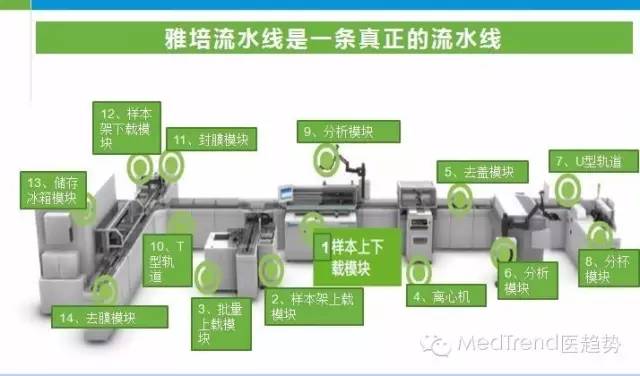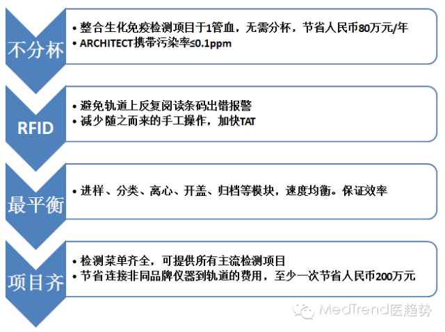 縱觀(guān)IVD國(guó)際品牌的發(fā)展歷程,都是從低速生化朝高速生化發(fā)展,由單機(jī)朝向集成化、自動(dòng)化、流水線(xiàn)的方向發(fā)展。由于中國(guó)病人的過(guò)度集中于大型三級(jí)醫(yī)院,年收入超過(guò)10億的醫(yī)院每天樣本量超過(guò)1000個(gè),高速儀器是高端醫(yī)院的剛需,因此研發(fā)高速儀器的能力也是未來(lái)進(jìn)入大型公立醫(yī)院的前提要求,流水線(xiàn)、生化免疫聯(lián)機(jī)是大勢(shì)所趨。