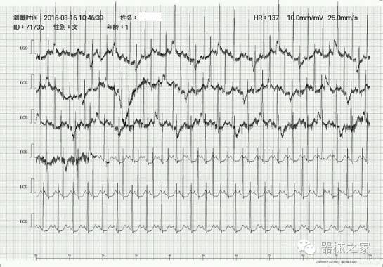 3、關(guān)于抗干擾能力,對于只有兩個電極沒有地線的情況下,對這個機(jī)器的要求真的不能太高?;€干擾和不穩(wěn)定是經(jīng)常的,所以需要測試人配合安靜勿動。測試1描測的心電圖除了只有一個導(dǎo)聯(lián)的限制之外,基本可以滿足各項心電圖數(shù)據(jù)的測量。測試2和3都是處于深度鎮(zhèn)靜氣管插管的小兒,出現(xiàn)兩個問題:1.小兒腹軟且腹部動度較大導(dǎo)致呼吸波干擾明顯,所以建議把左下腹電極片貼到左髂部或左股部外側(cè);2.基線干擾更加明顯,這時本人手握患兒左下肢后基線干擾消失,對心電記錄波形沒有產(chǎn)生明顯影響。